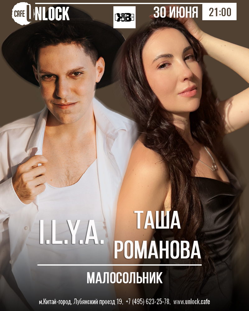 Пятничным вечером 30 июня вы окажетесь в атмосфере искреннего творчества и хорошего настроения. В этот раз в формате «малосольник» на сцене уютного Unlock-cafe выступят резиденты проекта «Квартирник-FM» Таша Романова и I.L.Y.A. «Квартирник-FM» это коммьюнити разножанровых музыкантов, пишущих авторскую музыку, уникальный формат, построенный не на конкуренции, а объединяющий талантливых людей! Малосольники это формат, где сольный концерт делят два артиста пополам. Это уникальная возможность прийти на один концерт и услышать сразу двух интересных артистов.